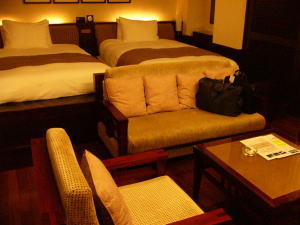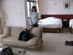 The room which was on the third floor had living room and two beds and there was a large Veranda This room size was almost same size as the Yanbaru Hotel, but the bath room and rest room were larger.