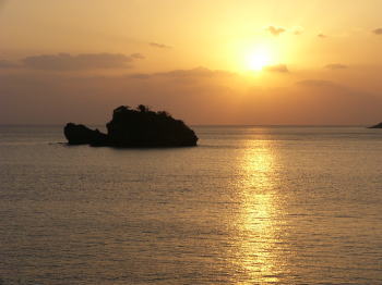 We walked along the beach and went to the town near the hotel. We could find a small store and bought a bottle of Awamori, beer and soft drink. After we returned and took a rest, we ate dinner at a restaurant in a hotel. We could see the beautiful sun set from the restaurant, so I took pictures. We had drinking party with Awamori Kumesen and talked about our travel.